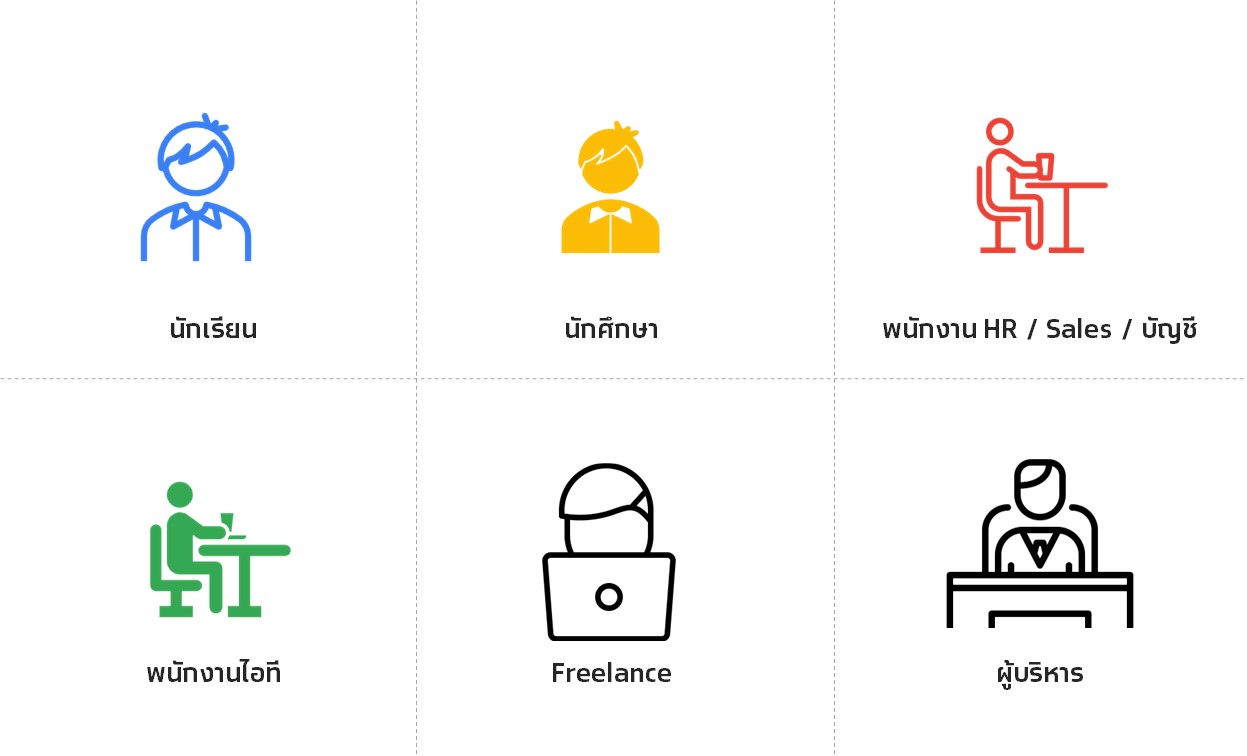 ตั้งแต่ นักเรียน / นักศึกษา พนักงานในกลุ่มสาขารอาชีพต่าง ๆ รวมถึงกลุ่มผู้ประกอบการ (SME)